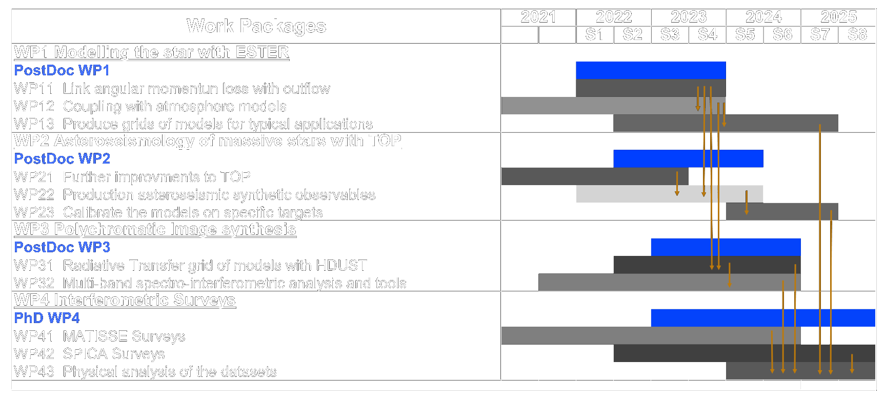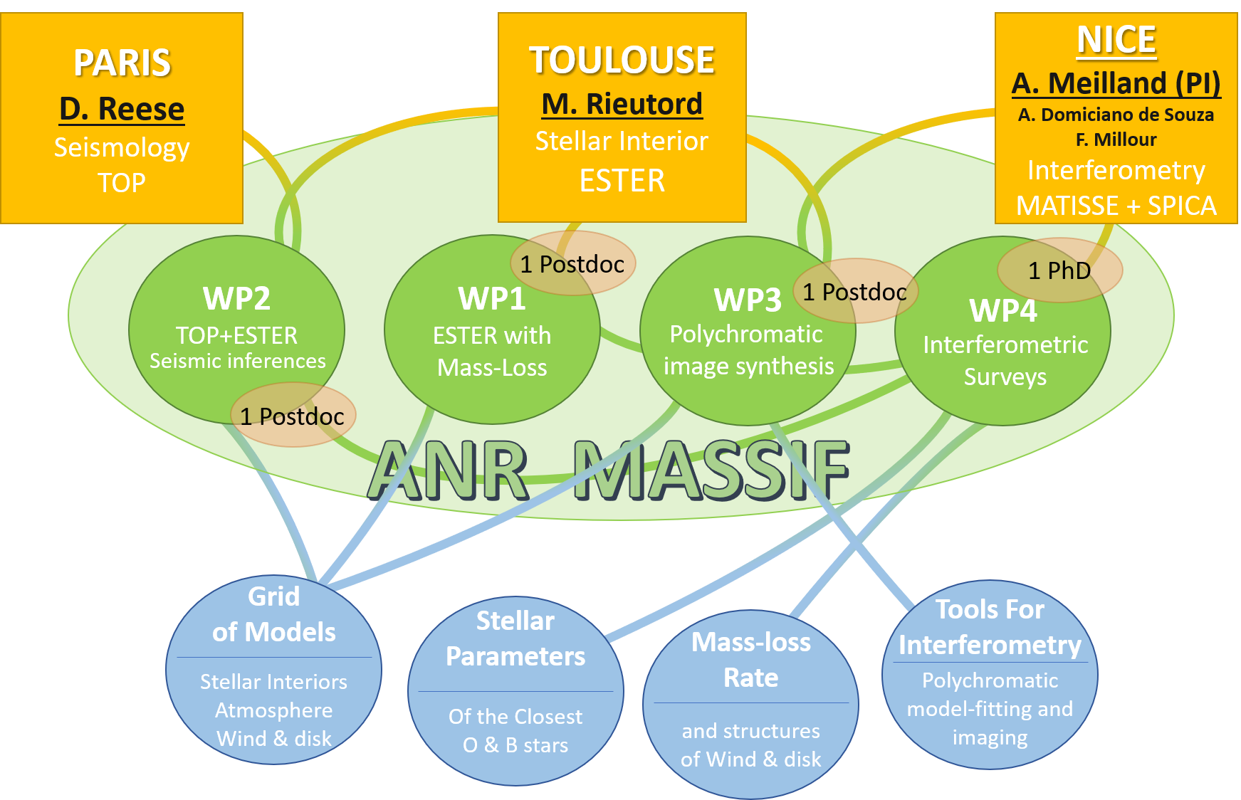 Building on this success, we now propose to apply the same methodology on a large sample of more massive stars. To reach this goal, we need to improve our modelling of stellar interiors including rotation, pulsations and the launching of a radiative wind. These tasks will be performed in the first two work-packages of this ANR project (WP1 & WP2). The third work-package (WP3) deals with modelling large amounts of interferometric data, with a focus on improving grids of radiative transfer models of CSE of massive star disks and winds, and on polychromatic modelfitting and image reconstruction techniques. The last work-package (WP4) focuses on surveys of massive stars observed at the highest possible resolution, which includes data already acquired from the first generation of instruments at the VLTI and CHARA and new visible and infrared observations of 200 stars. The Figure below summarises the organisation of our ANR MASSIF and the WPs are detailed in dedicated sections.